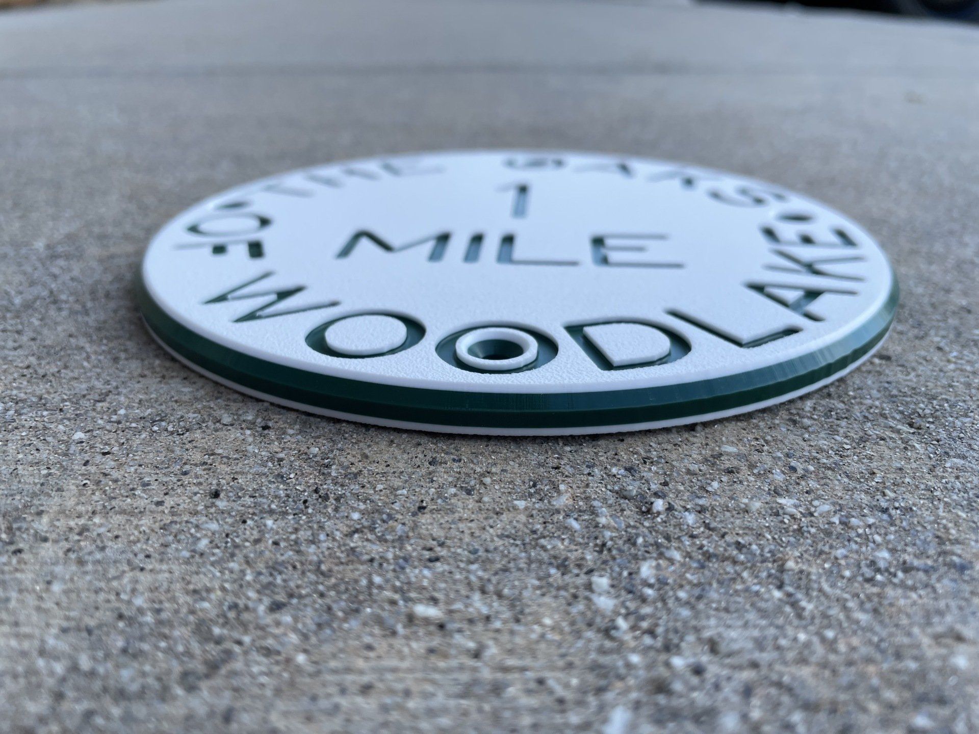 Flush-mounted trail or mile markers are fabricated from aluminum, stainless steel, or polyethylene. They are permanently installed (top row photos) at grade level into the concrete or black top. They can be any shape, size, or color, and are clear-coated so they will last for decades.